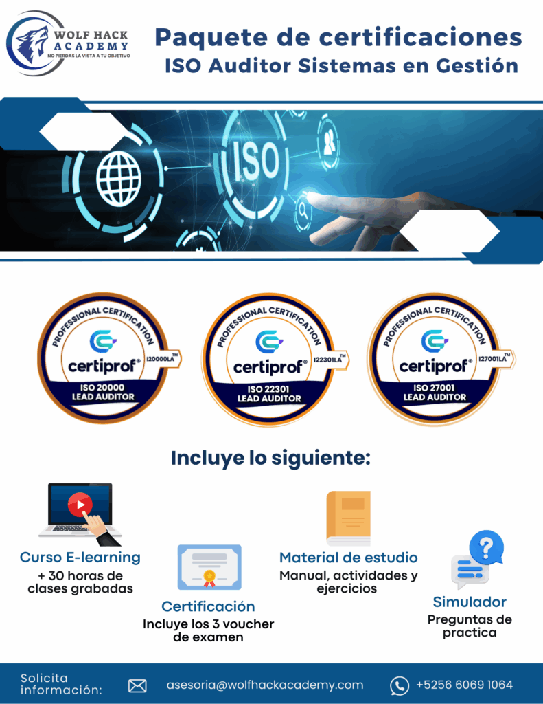 EL curso de auditor líder para las normas ISO 20000, ISO 22301 e ISO 27001, aprenderás a planificar, llevar a cabo y gestionar auditorías de sistemas de gestión en el ámbito de TI, continuidad de negocio y seguridad de la información. La ISO 20000 se centra en la gestión de servicios de TI, enseñándote a evaluar y mejorar la eficiencia de estos servicios para satisfacer las necesidades del negocio y del cliente. La ISO 22301 te capacitará para auditar sistemas de gestión de continuidad de negocio, asegurando que una organización pueda mantener sus operaciones críticas durante y después de una interrupción.